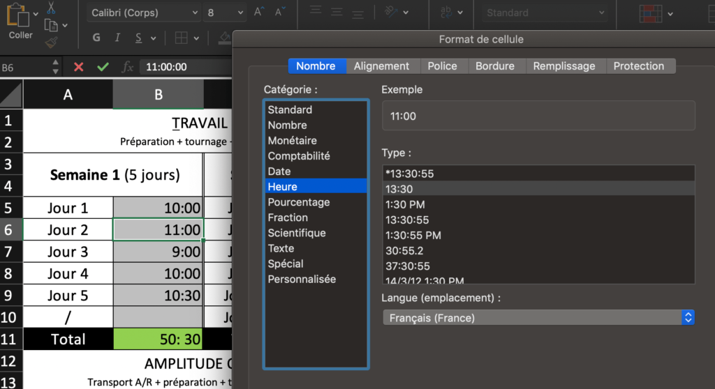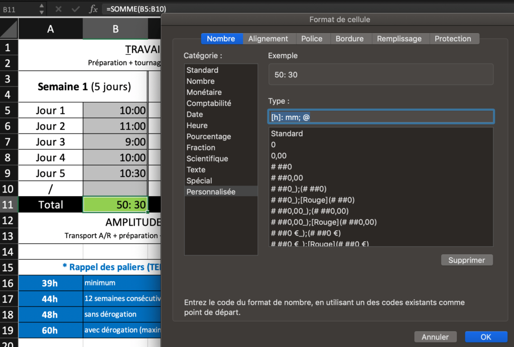 Personnaliser la cellule avec la mention « [h]: mm; @ » est important car cela permettra d’afficher une durée supérieure à 24 heures dans le total.
