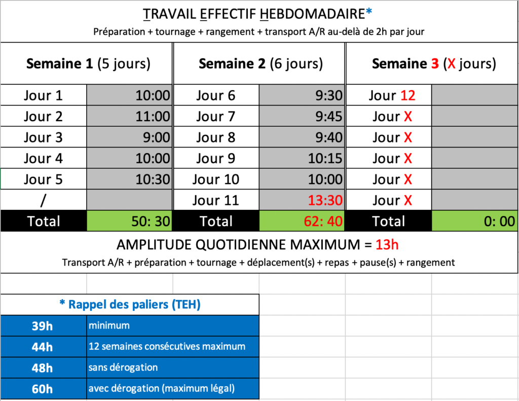 Dans l’exemple ci-dessus, ce tableau vous permet de calculer simplement des heures par jour et par semaine de tournage (modèle appliqué à la CCNPC de 2012) !
