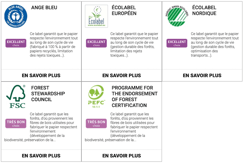 NDLR : Dans l’illustration ci-dessous, les trois premiers labels concernent le papier et la gestion des forêts pour les deux suivants.