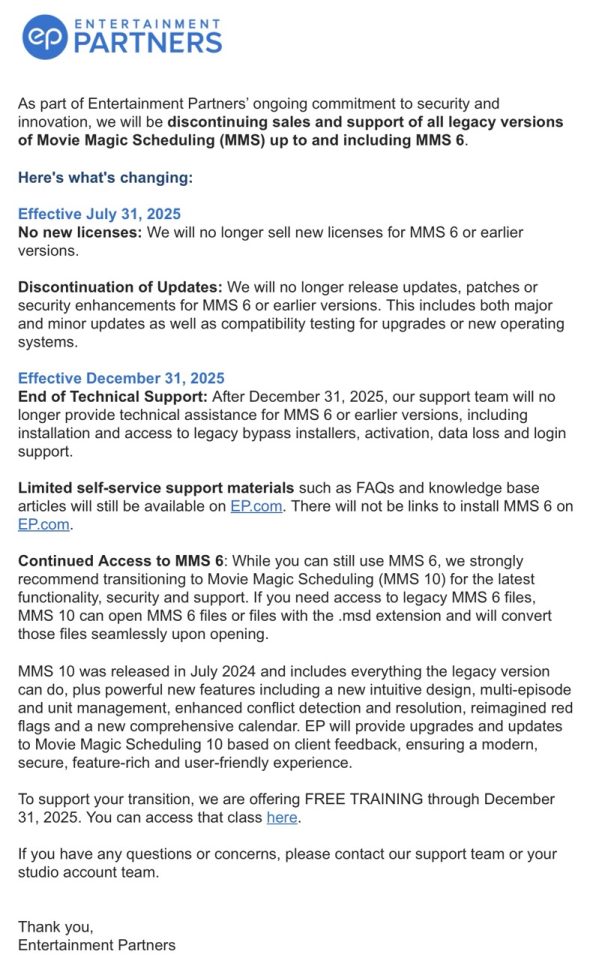 Le 24 juillet dernier, le fabricant du logiciel bien connu des assistant(e)s, Entertainment Partners, envoyait un courriel informant ses utilisateurs de l’arrêt des ventes de MMS 6, de ses « updates », au 31 juillet 2025 et de la discontinuité du support technique au 31 décembre de cette même année.