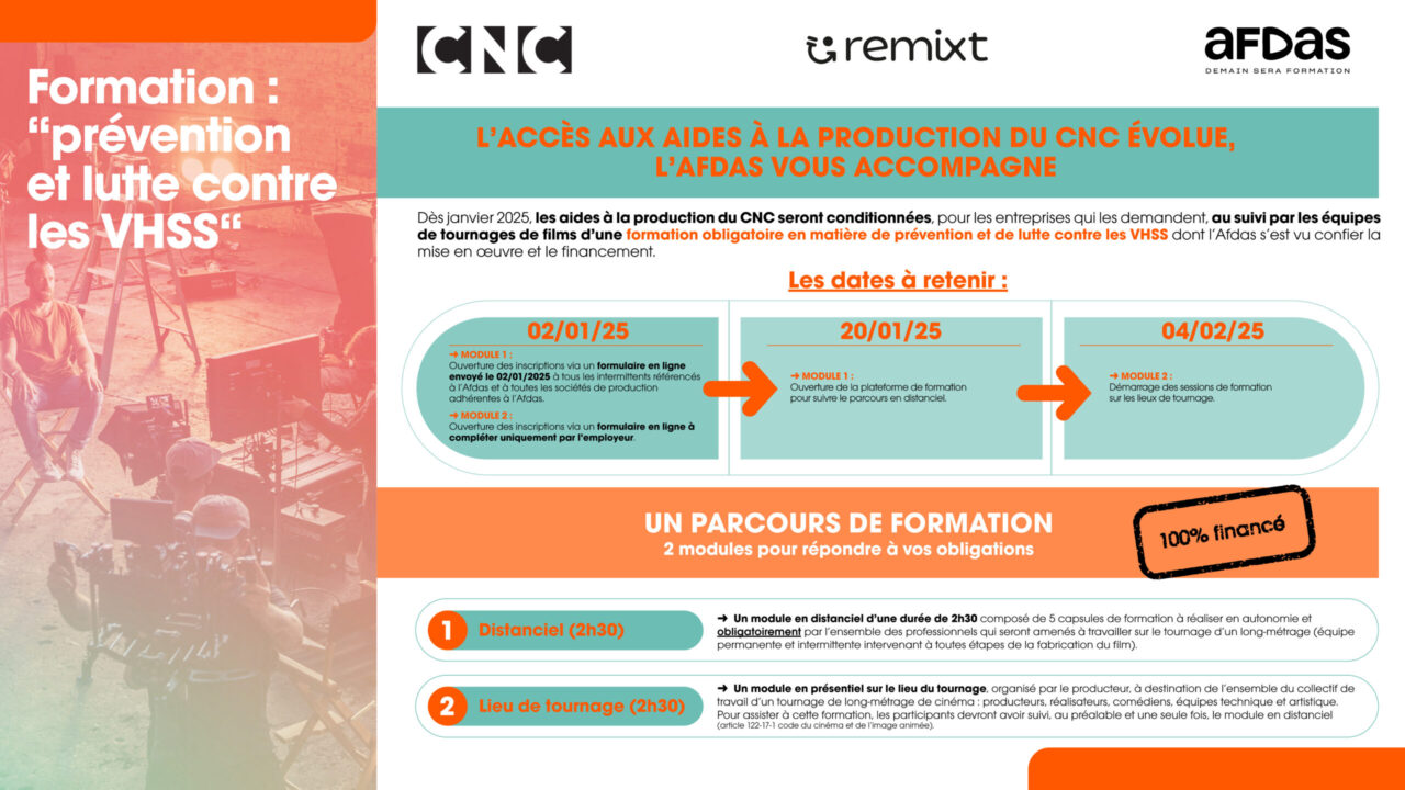 Depuis le 1er/01/2025, pour les tournages débutant au 1er/02/2025, les aides à la production du CNC de ces productions sont conditionnées par le suivi, par les équipes de tournage de films, d’une formation obligatoire et spécifique en matière de prévention et de lutte contre les VHSS (Article 122-17-1 du RGA).