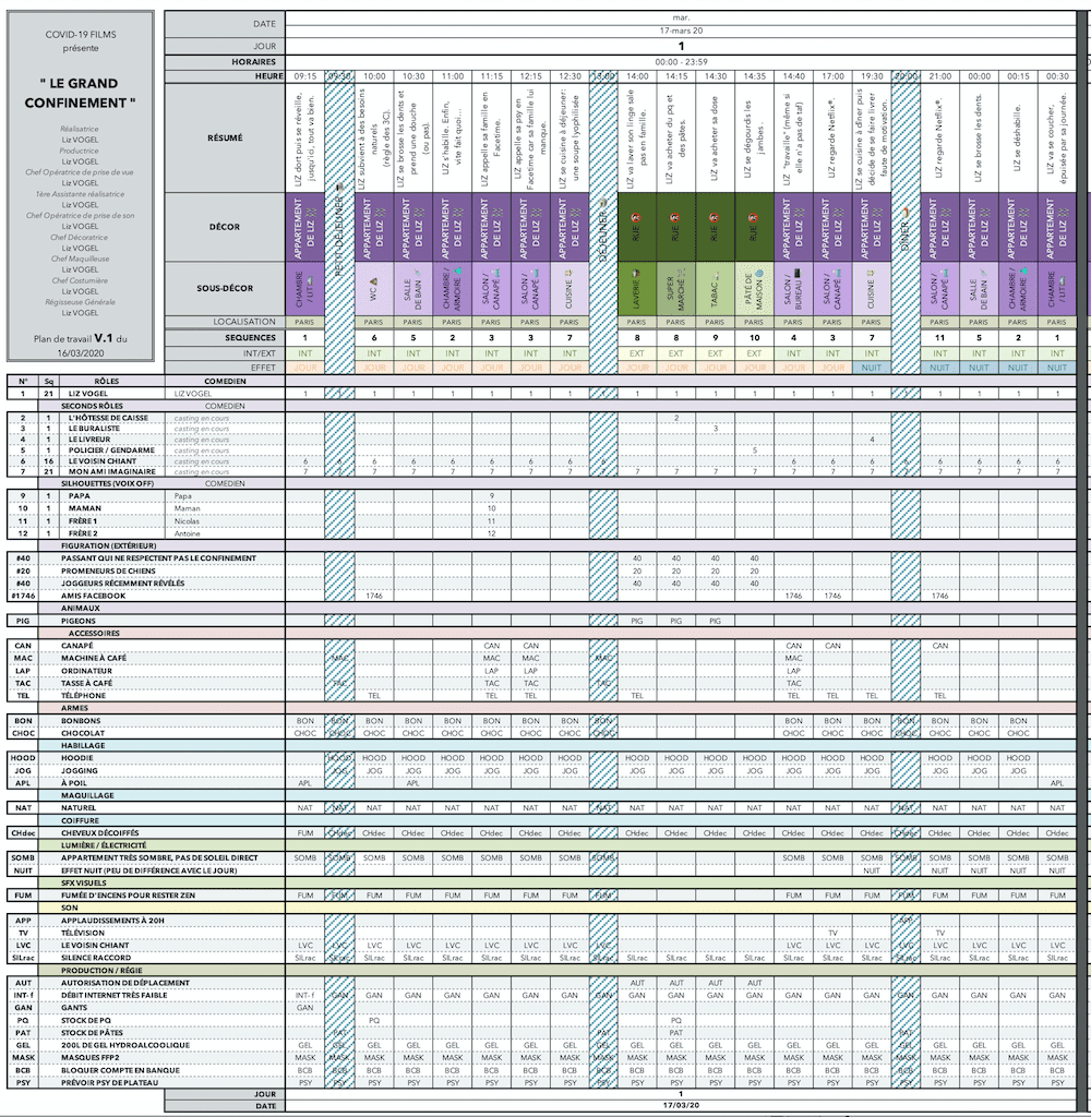 Quand la presse recommande d’« organiser rigoureusement ses journées » pour éviter l’anxiété du confinement, certains les prennent au mot ! C’est le cas d’une assistante réalisateur, prénommée Liz Vogel, qui a rédigé un plan de travail intitulé « Le grand confinement » version 1 !