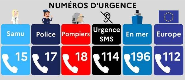 Accessible gratuitement partout dans l’Union européenne, le 112 a pour but d’offrir, en plus des numéros d’urgence nationaux, un numéro d’appel unique dans tous les États membres de l’UE. Par contre, en France, il est préférable de contacter le 15 (urgence médicale), le 17 (police secours), ou le 18 (pompiers) pour obtenir directement le service de secours adapté à la situation. – Direction de l’information légale et administrative (Premier ministre)