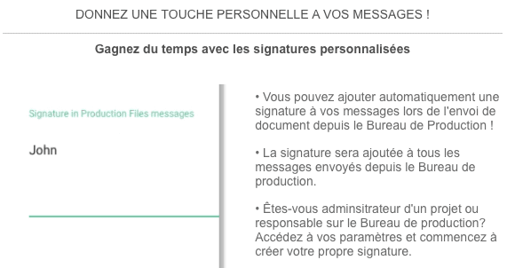 – Depuis novembre 2017, Setkeeper lance les signatures personnalisées : « Vous pouvez ajouter automatiquement une signature à vos messages lors de l’envoi de document depuis le Bureau de Production !« .