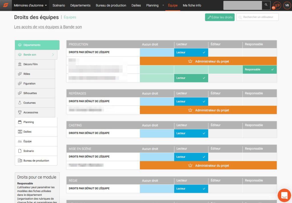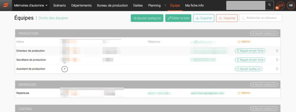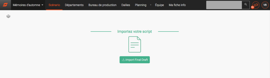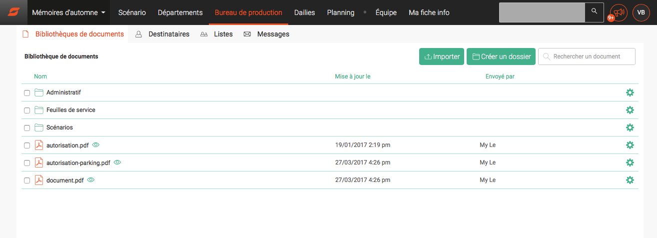 Comme son nom l’indique, c’est un espace à priori dédié à l’équipe de production dans lequel on stocke et on partage des documents importés et dans les types de format, aussi bien en préparation qu’en tournage (versions du scénario, dépouillements, listes divers, autorisation de prises de vues, feuilles de service…).