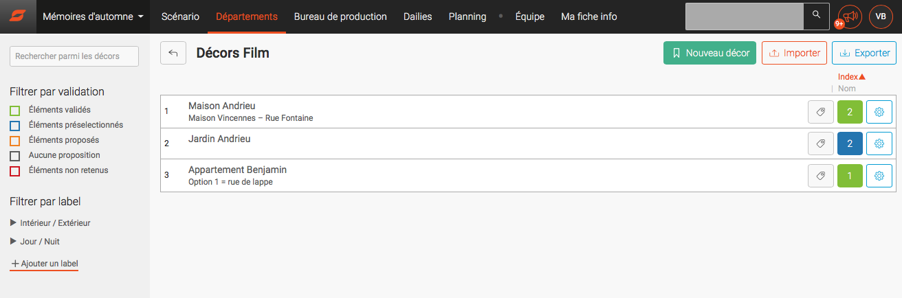 Que vous ayez ou non importé un scénario dans Setkeeper, la plateforme vous proposera par défaut 7 départements dans votre nouveau projet : Décors, Casting, Figurants, Costumes, Accessoires, Décoration, Musique. Vous pouvez en supprimer (ils sont archivés) ou en ajouter (Véhicules, Moodboards…).