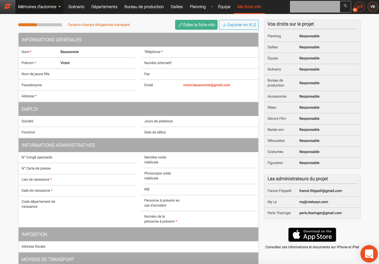 À noter ! La possibilité d’exporter la liste des membres de l’équipe sous Excel (.XLS), avec toutes les informations utiles à la production sur chaque technicien du projet.