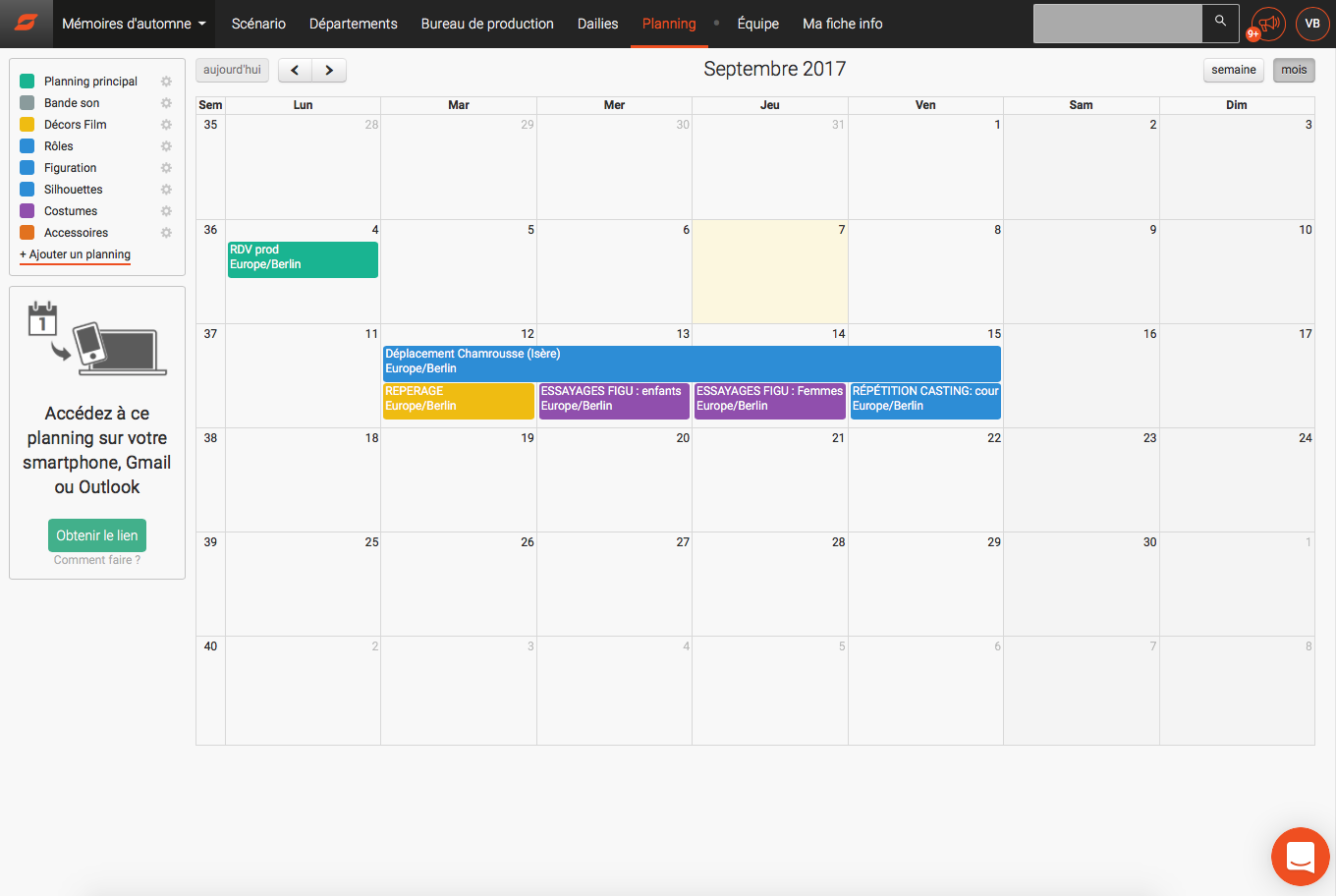 Tous les utilisateurs peuvent synchroniser les rendez-vous qui les concernent avec leur propre calendrier (iCal, Google Calendar, smartphone ou leur compte Outlook). Plutôt complet ! Vous pouvez aussi y renseigner les disponibilités des techniciens et des comédiens.